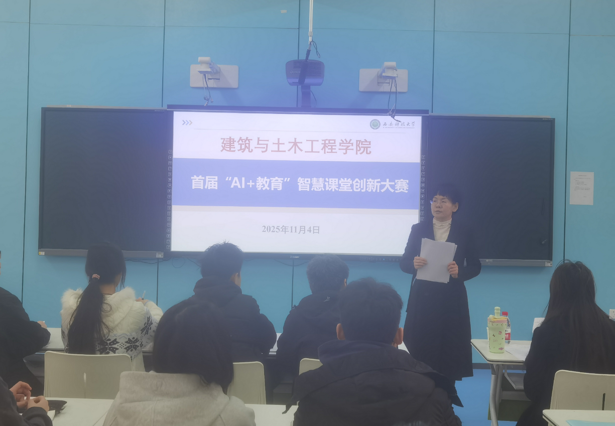 为深化数智技术与课堂教学的深度融合,全面提升教师教学创新能力与人才培养质量,11 月 4 日下午,建筑与土木工程学院首届 “AI + 教育” 智慧课堂创新大赛在临潼校区 3 号教学楼 205 教室顺利举行,大赛特别邀请校内外AI教育技术专家担任评委,为参赛教师提供专业点评与指导,大赛由副院长唐丽云主持。学院党委书记尚长春、副院长任翔,教学质量监督评估中心副主任赵蕾、校督导邸芃、各系主任及教师代表现场观摩比赛。