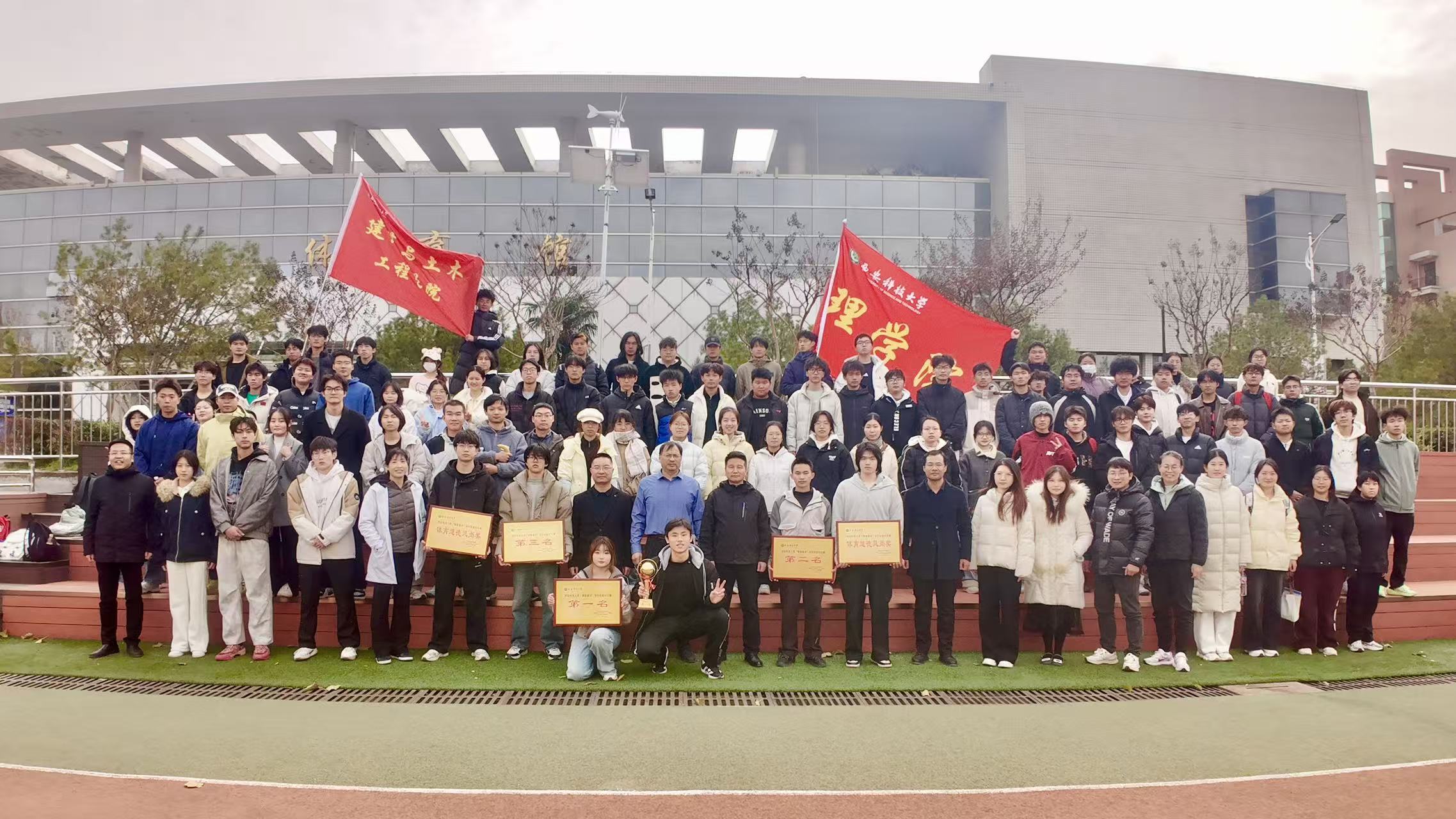 对抗赛设有4×250米混合接力、引体向上/俯卧撑极限赛、团队跳绳、立定跳远团体赛及平板支撑挑战赛五个项目,全面考验学生的体能、耐力与协作能力。赛场上,建工学子展现出坚韧务实的作风,理学健儿则发挥出冷静专注的特长,双方在竞争中彼此尊重、在协作中共同进步,展现出良好的体育风尚。经过激烈角逐,各项成绩在闭幕式上揭晓。与会领导为获得团体总分奖、各单项奖以及“体育道德风尚奖”“最佳风采运动员”的代表颁奖。