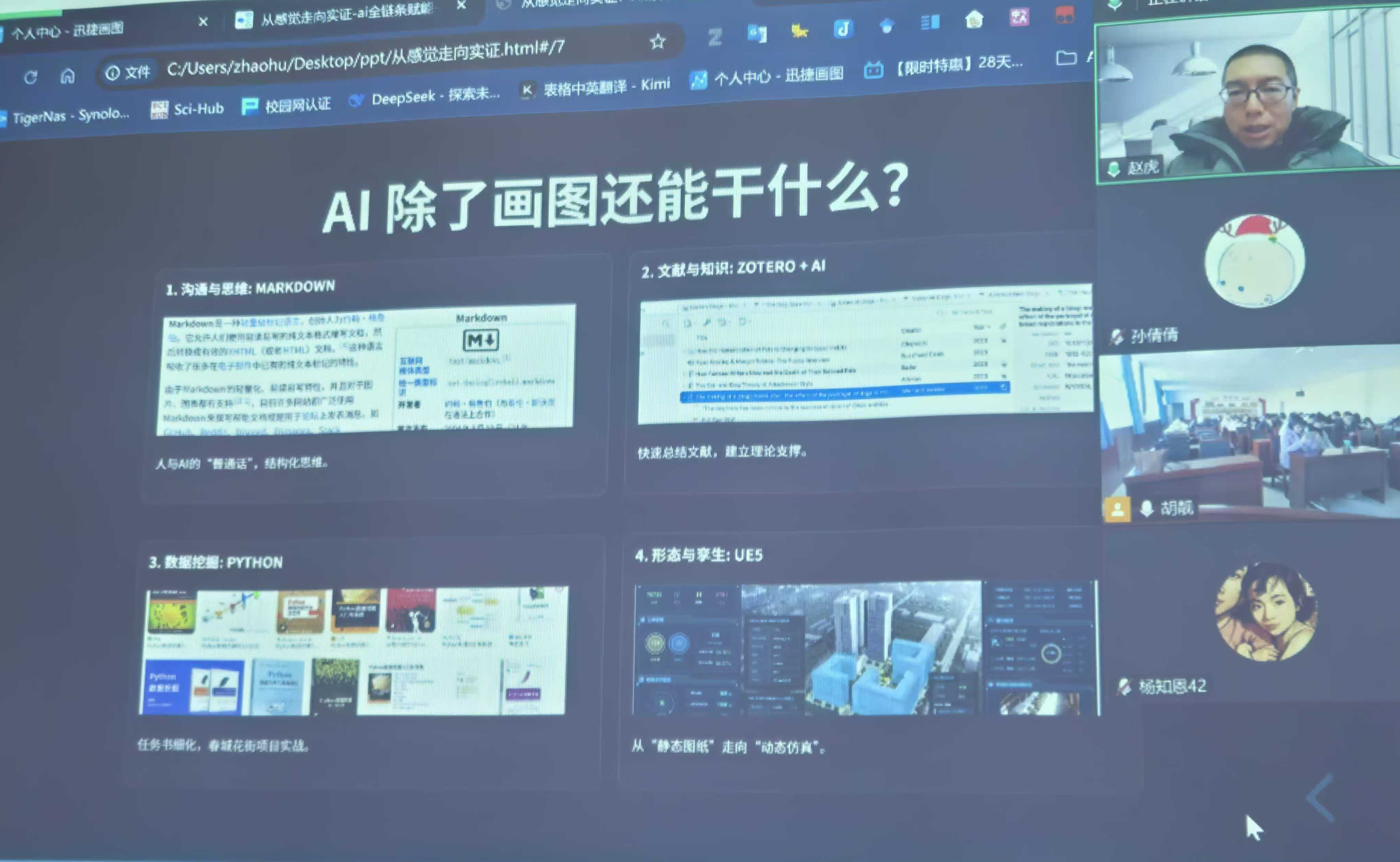 赵虎教授从人工智能的底层架构切入,系统梳理当前主流AI技术的运行机制与发展脉络,深入分析算法模型、数据驱动设计与生成式技术在建筑领域的应用潜力。他指出,AI不仅是工具层面的升级,更是设计范式与行业生态的深刻变革力量,正在重塑建筑师的思维方式与工作模式。在方法论层面,赵教授结合实际案例,介绍了AI在参数化设计、性能分析、功能模拟与空间生成等方面的应用路径,强调建筑师应由“操作型技能”向“系统整合能力”转变,提升对AI工具的理解深度与批判性判断,实现与AI协同增效。