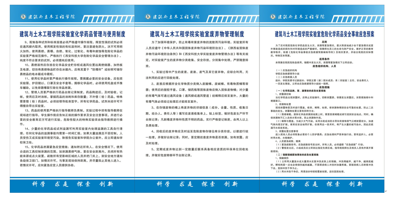 “十四五”期间,完成了实验室通风、水电及安全防护系统全面升级,实验实训条件得到根本性改善,累计投入经费近20万元。对10余间实验室室内墙体进行粉刷、线路改造、门禁系统升级。对北院长期堆积的实验垃圾进行了彻底清理,改善了我院师生的实验和工作环境。针对北院结构工程实验室长期存在的安全隐患进行了全面整改,完成了内外墙粉刷、室内隔断拆除、线路改造、思政教育实践基地建设等。对北院室外实验场地环境进行了综合整治,安装围栏、监控设备,并通过划分责任区域的形式规范使用。对北院建工楼一楼楼道展板进行了更新,制作近五年新采购设备的简介、实验平台介绍等共计21块展板。对虚拟仿真实验室工作站进行了系统维护,对给排水实验室配备了实验室应急物品30多件,对危险品库房硬件环境进行了升级。