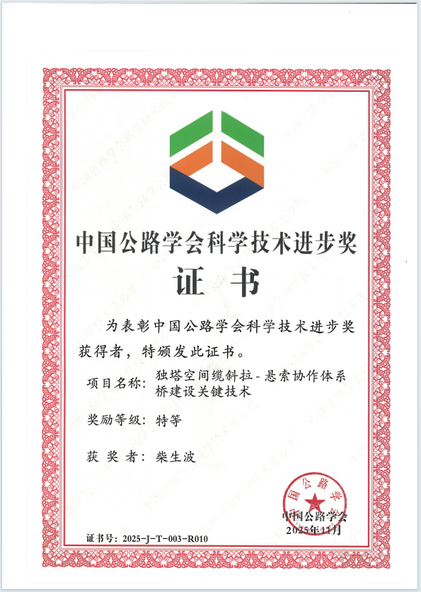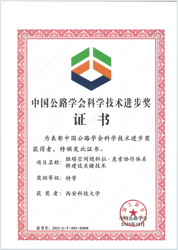 12月1日,2025年度中国公路学会科学技术颁奖大会在厦门召开,西安科技大学参与项目“独塔空间缆斜拉-悬索协作体系桥建设关键技术”获特等奖,我院柴生波老师团队参与该项目研究工作。