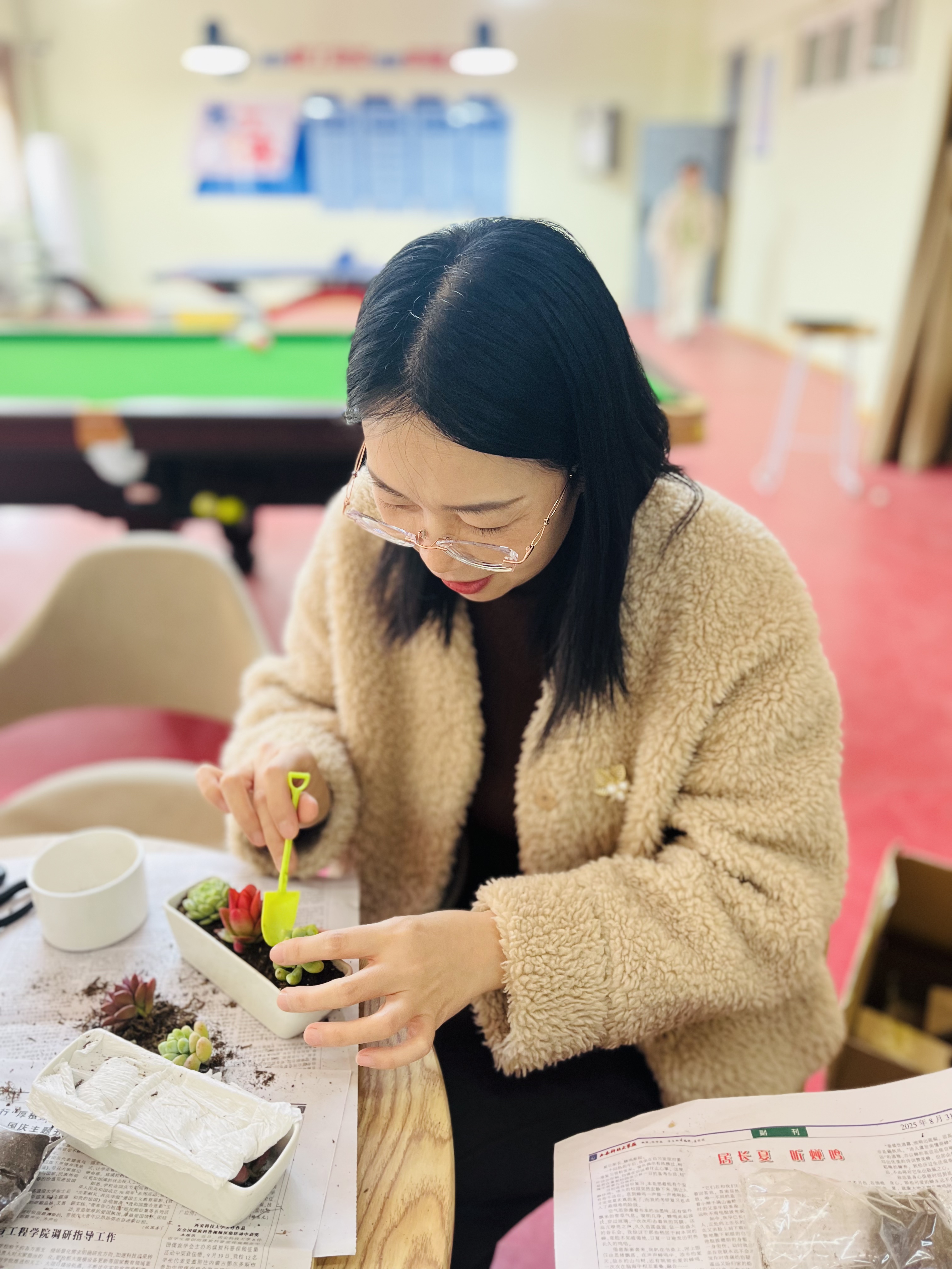活动现场暖意融融、花香氤氲,学院为大家准备了品类丰富、清新可爱的桌面小盆栽与多肉。在轻松愉悦的氛围里,女教工们化身花艺创作者,以指尖匠心搭配草木生机,或清新淡雅、或活泼俏皮,将零散花材精心组合成独属于自己的春日小风景。大家一边交流创作心得,一边感受花艺之美,欢声笑语间尽显温婉才情与优雅风采。