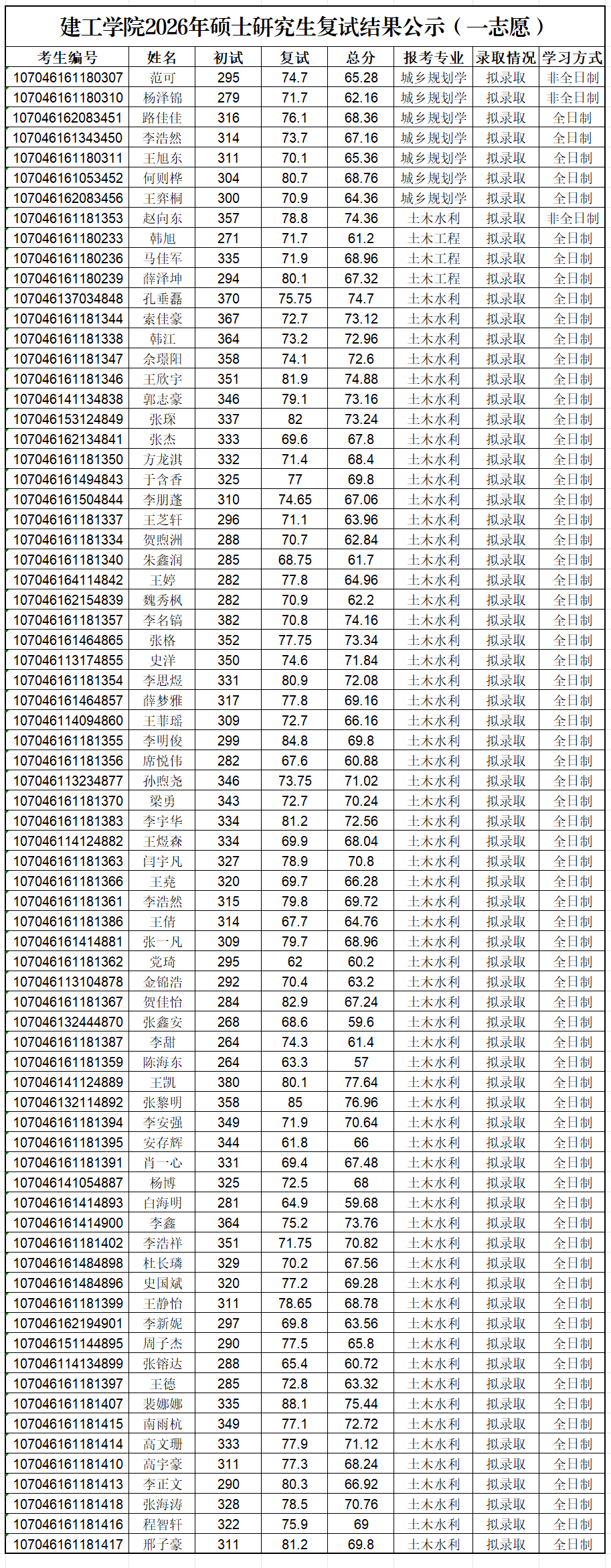建工学院2026年硕士研究生复试结果公示(一志愿)
